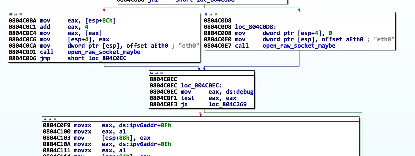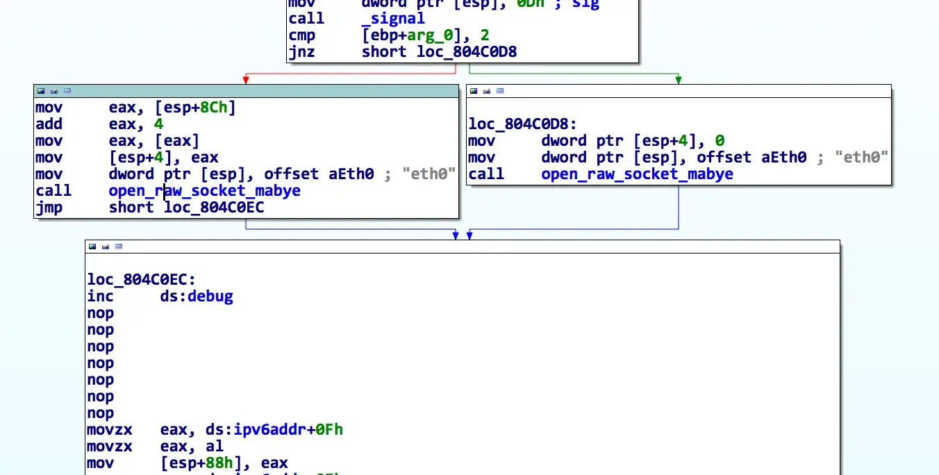 Let’s start by loading the binary into IDA (and HexRays). The first function is pretty ugly, but we can already see that it’s going to be a fun one. As shown below, there’s a debug print that prints an IPv6 address: