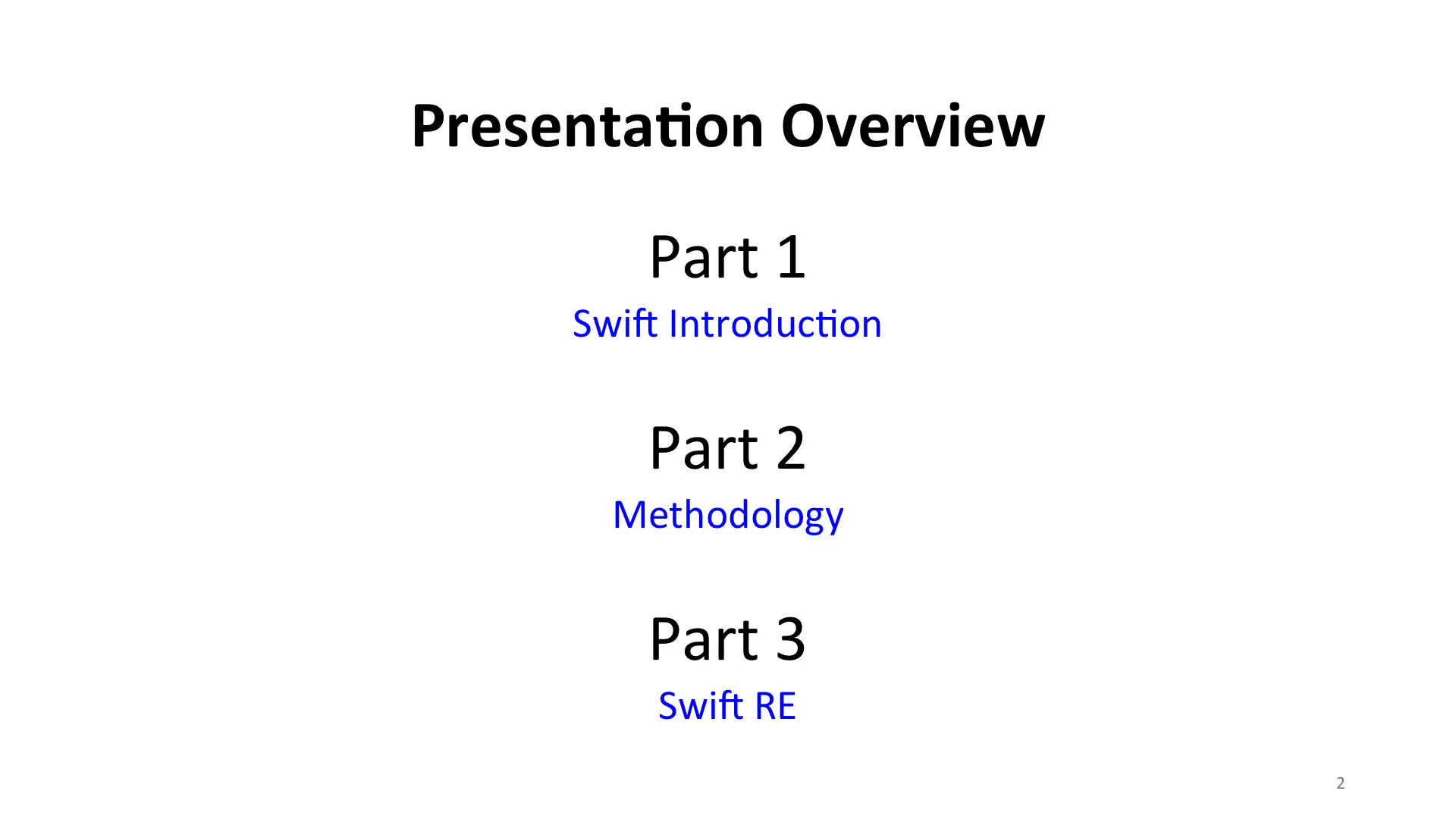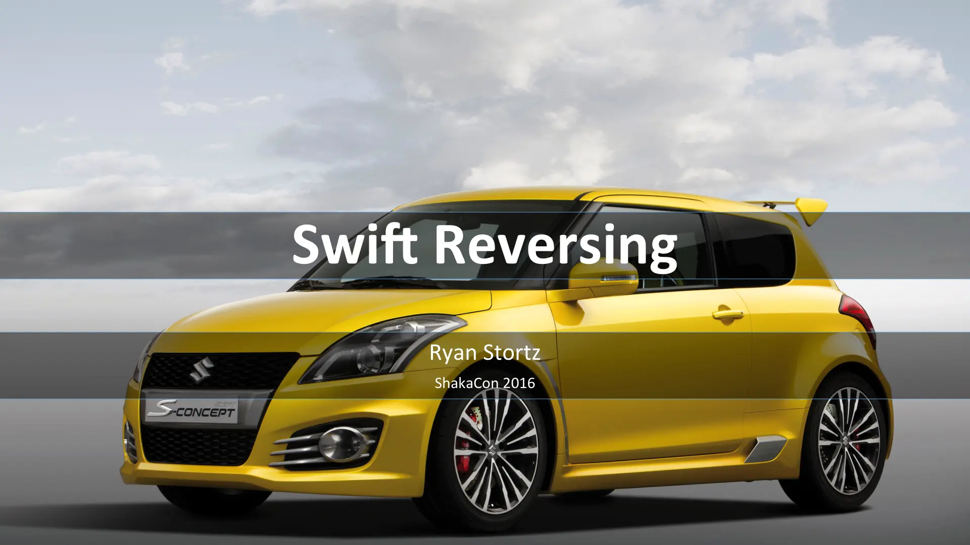 Hi, I’m Ryan Stortz and this is Swift Reversing. This is about the Apple programming language, not the inter-banking network. I’d probably have a solid gold laptop if I knew anything about Swift internals.