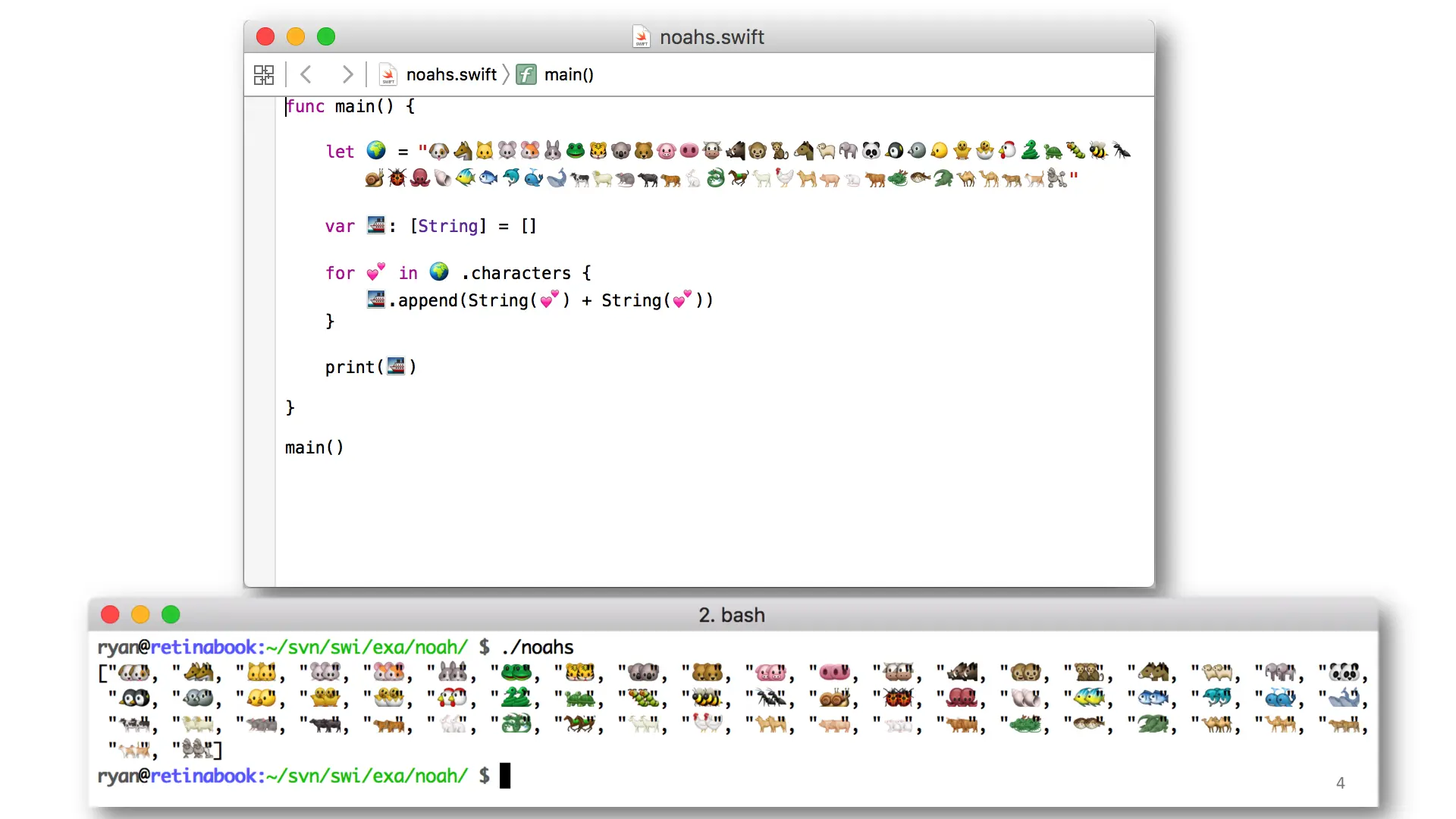 Swift is pretty expressive, you can commit atrocities like this one: Noak’s Ark. As you can see, we have the world and all the animals in the world. Then we allocate the ark as an array of strings. Then we iterate over each animal and 💕+💕 and two by two, we fill the ark.