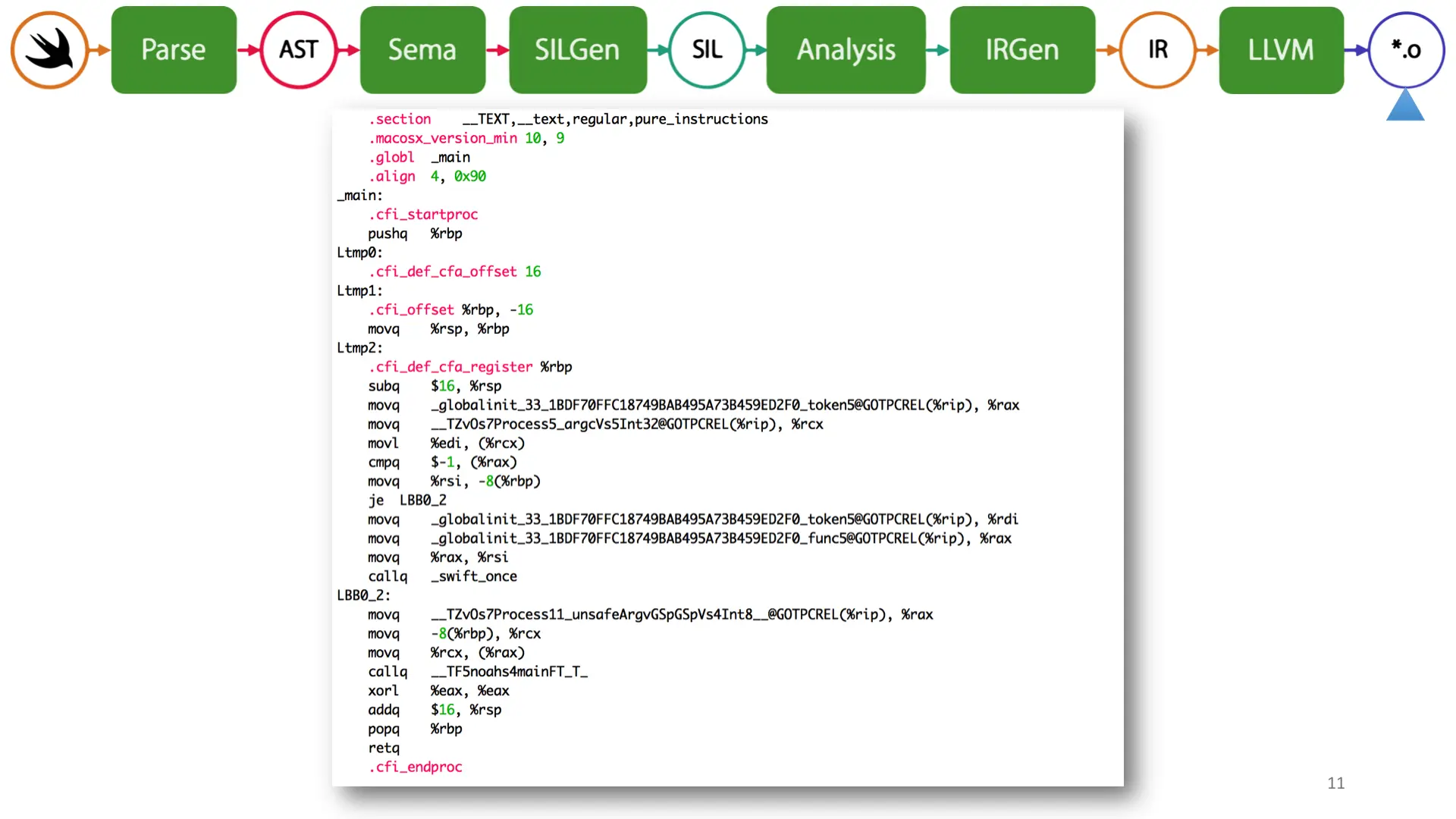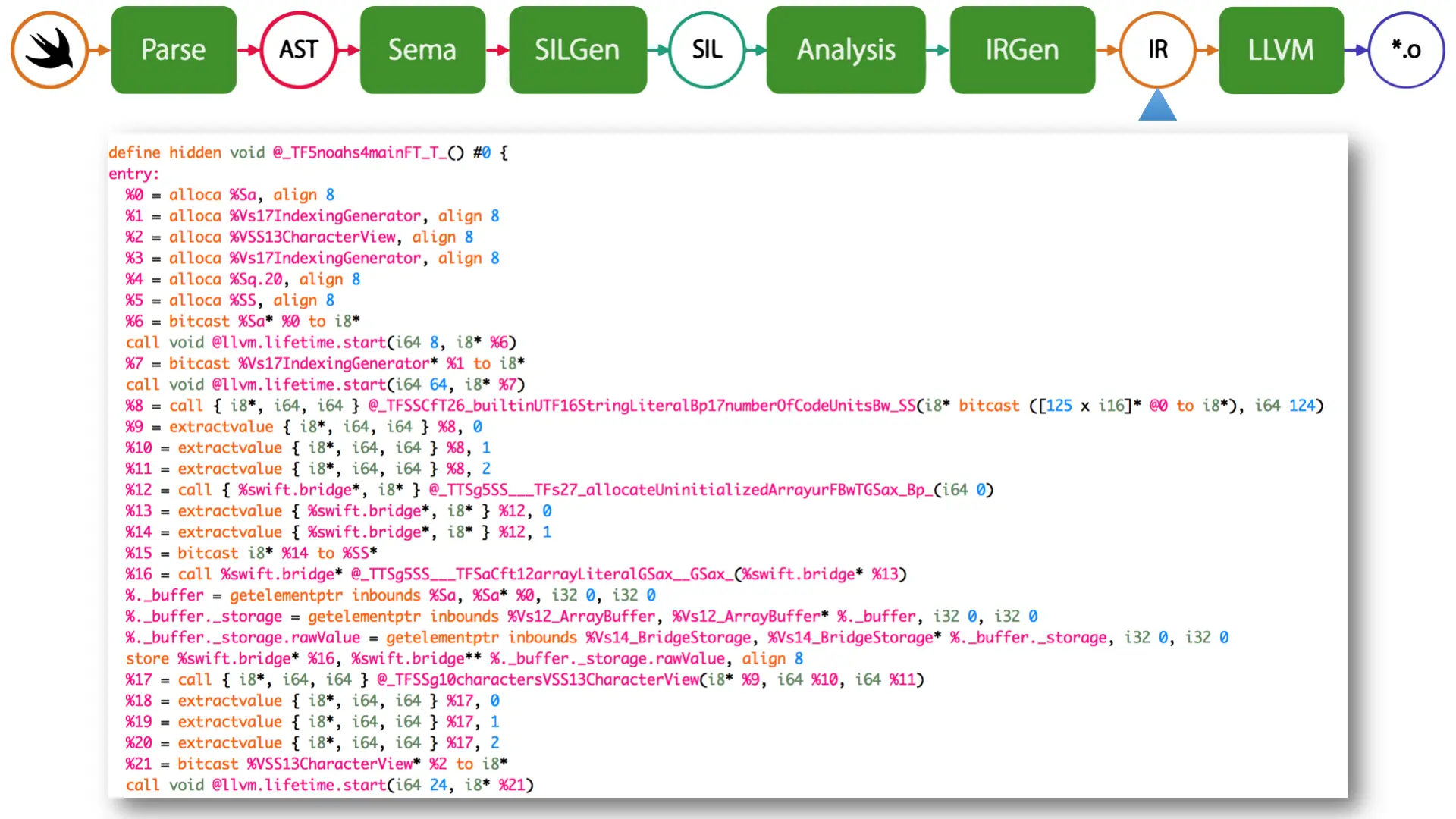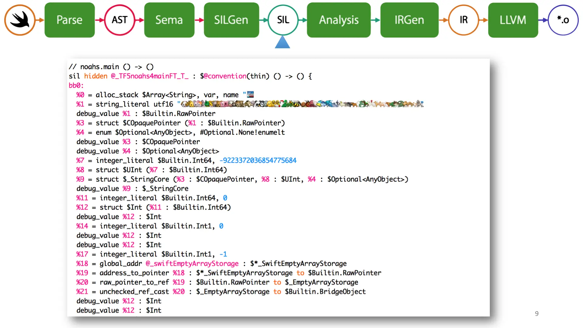 SILGen generates SIL, which is Swift’s IL. Swift does its language-specific analysis on SIL, a new intermediate layer that’s bolted on top of LLVM, but with a full awareness of Swift’s type system. If you’re familiar with LLVM or really any other SSA IR, you’ll notice that this one is at a higher abstraction layer. This allows Swift to heavily optimize in a safe manner, and I’ll get to an example in a moment.