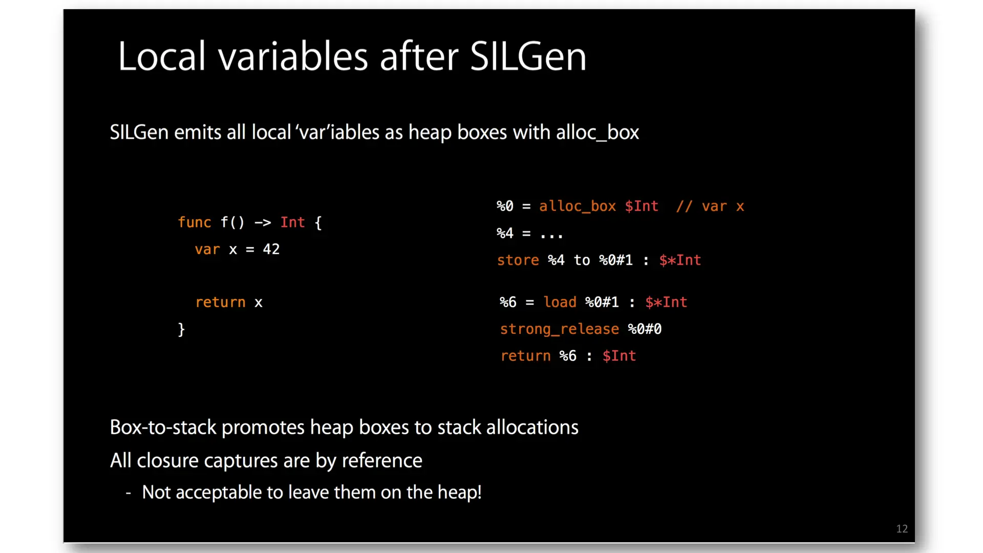 One last thing about SIL. Since Swift has many many ways to create closures, SIL has the alloc_box optimization which causes me a lot of heartache as a reverse engineer. By default, all variables and closures are allocated on the heap and then SIL’s guaranteed optimizations do an escape analysis pass to determine if the variable or closure escapes its local scope. If it doesn’t, it brings it onto the stack. This means there are 2-3 different representations for each variable and closure type.