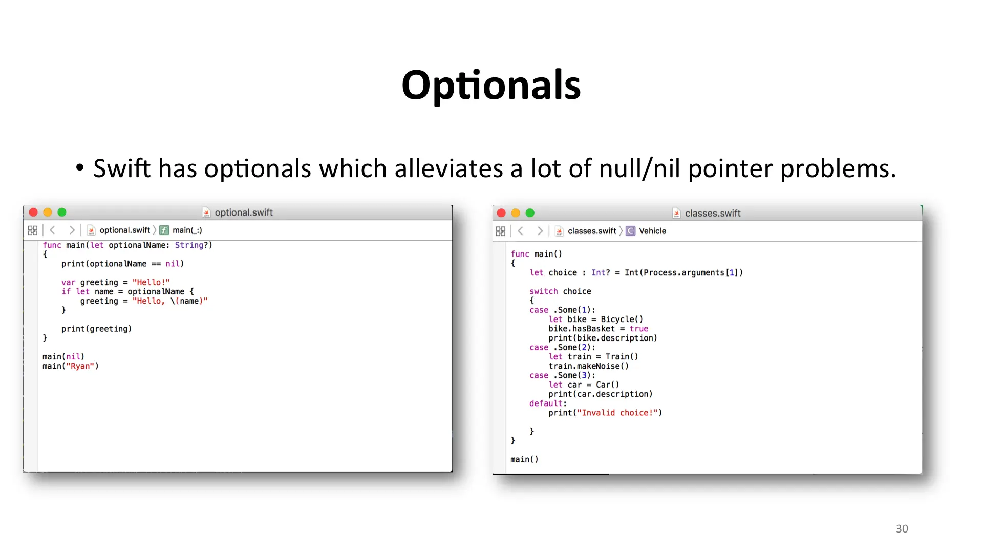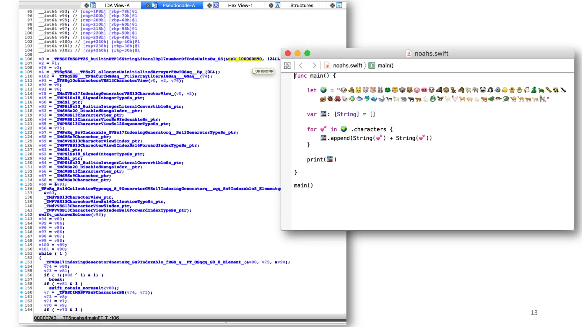 It has all the features you’d expect: closures, first-class functions, generics, etc. As a reverse engineer, more closures and generics could be problematic. These structs-that-are-really-classes might make certain cases easier to reverse. Swift also makes heavy use of optionals, which will likely add a ton of noise to the disassembly.