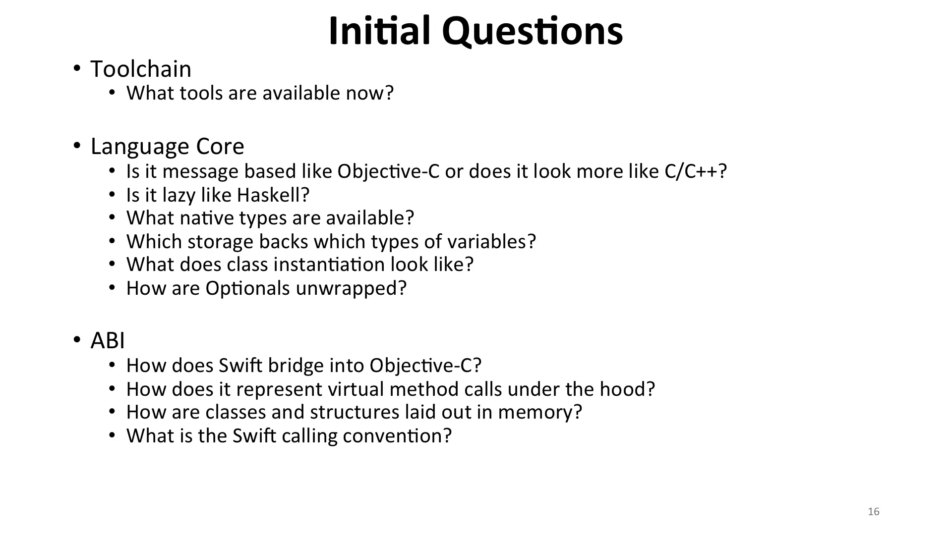 My initial questions focused on three areas: the toolchain, the language core, and the ABI. What tools are available to me now? Is the language message-based like Objective-C? What’s the Swift calling convention?