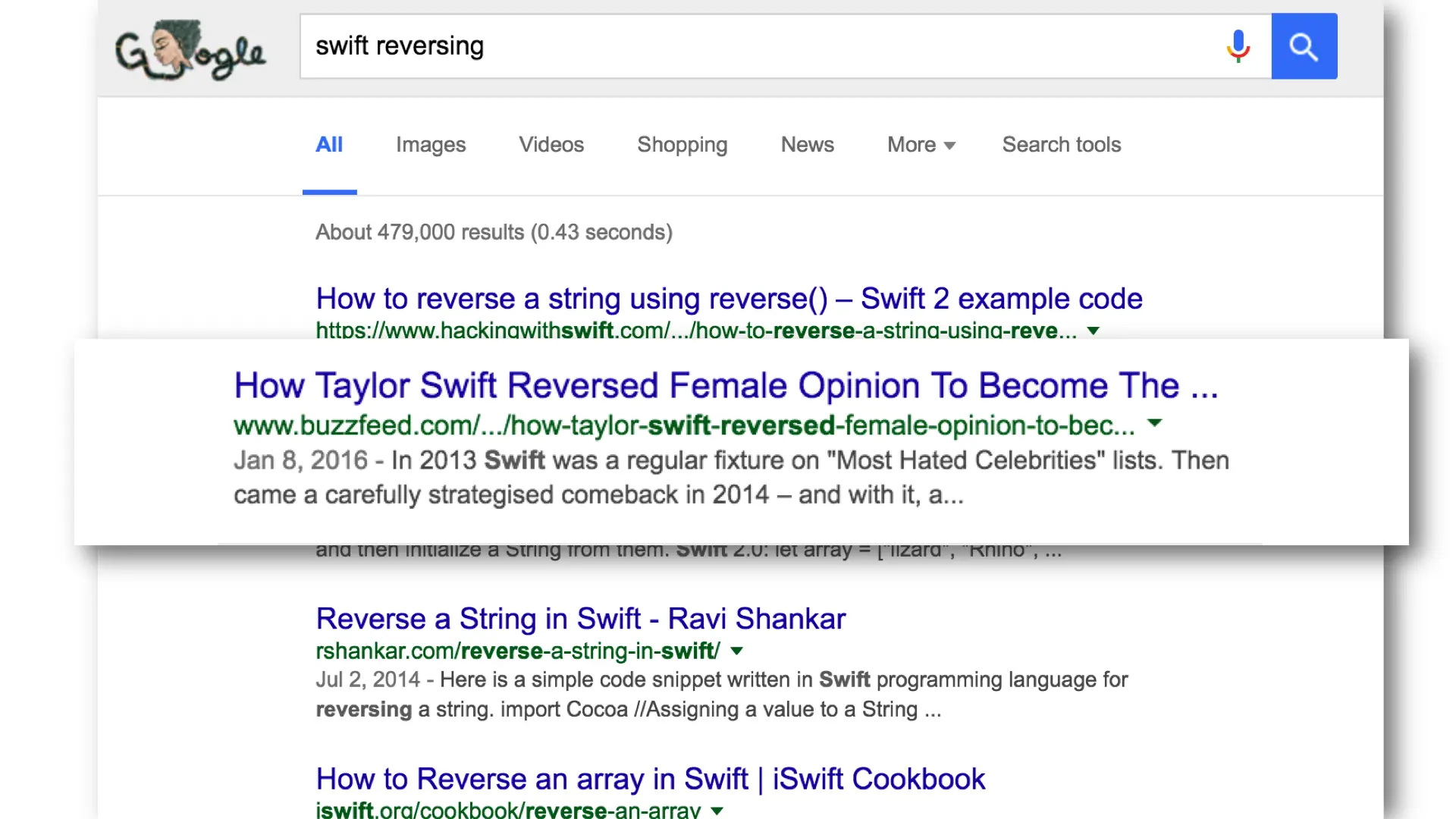 I started by Googling for Swift reversing. The first 9 results were about reversing a string or an array in Swift. The 10th result was how Taylor Swift reversed female opinions of her. So I knew my options were limited.