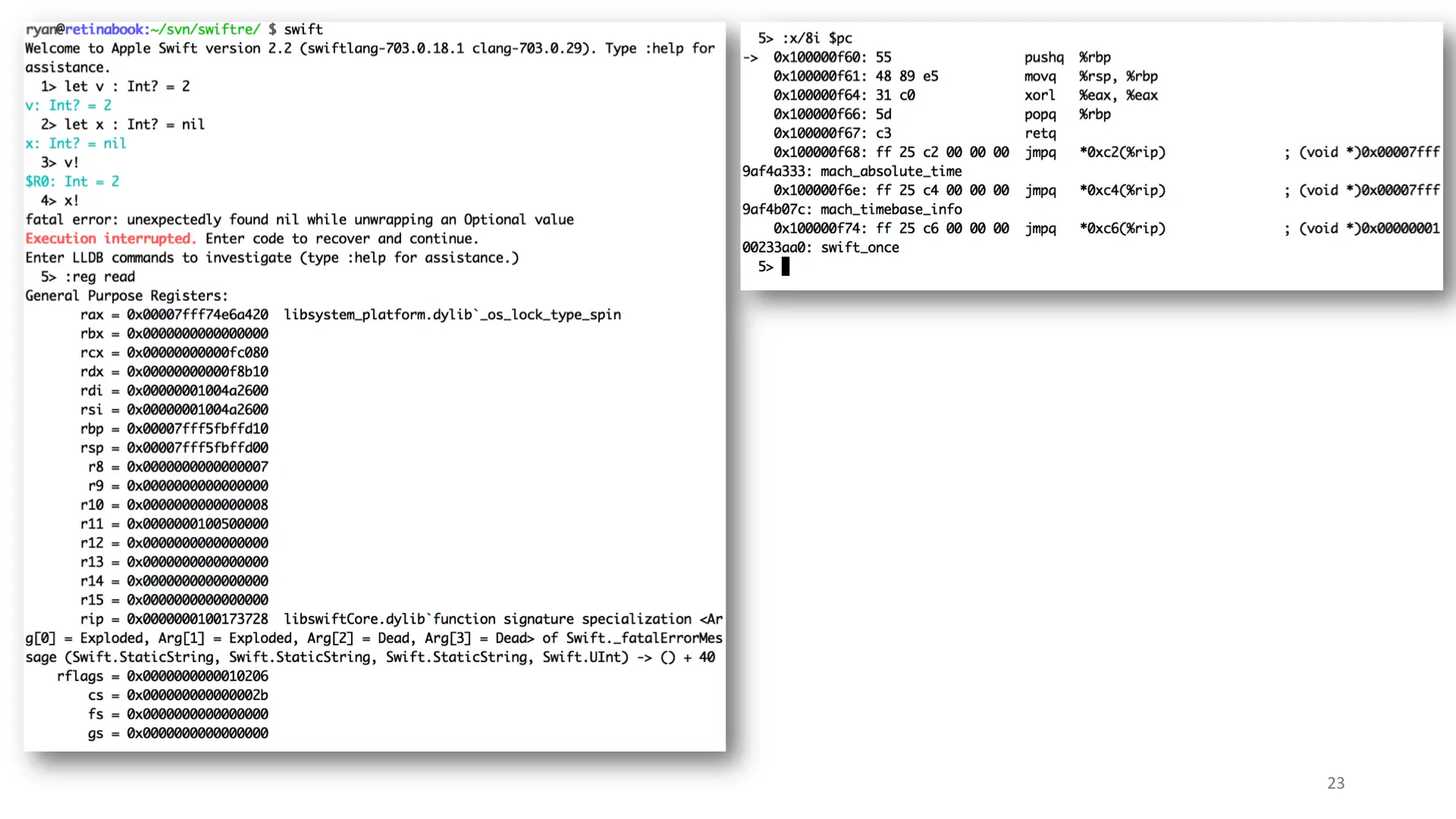 In my example, I force unpack an optional integer with a nil value. The REPL captures the crash and we can introspect it with lldb.
