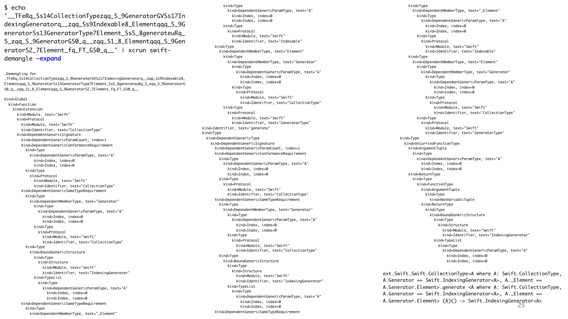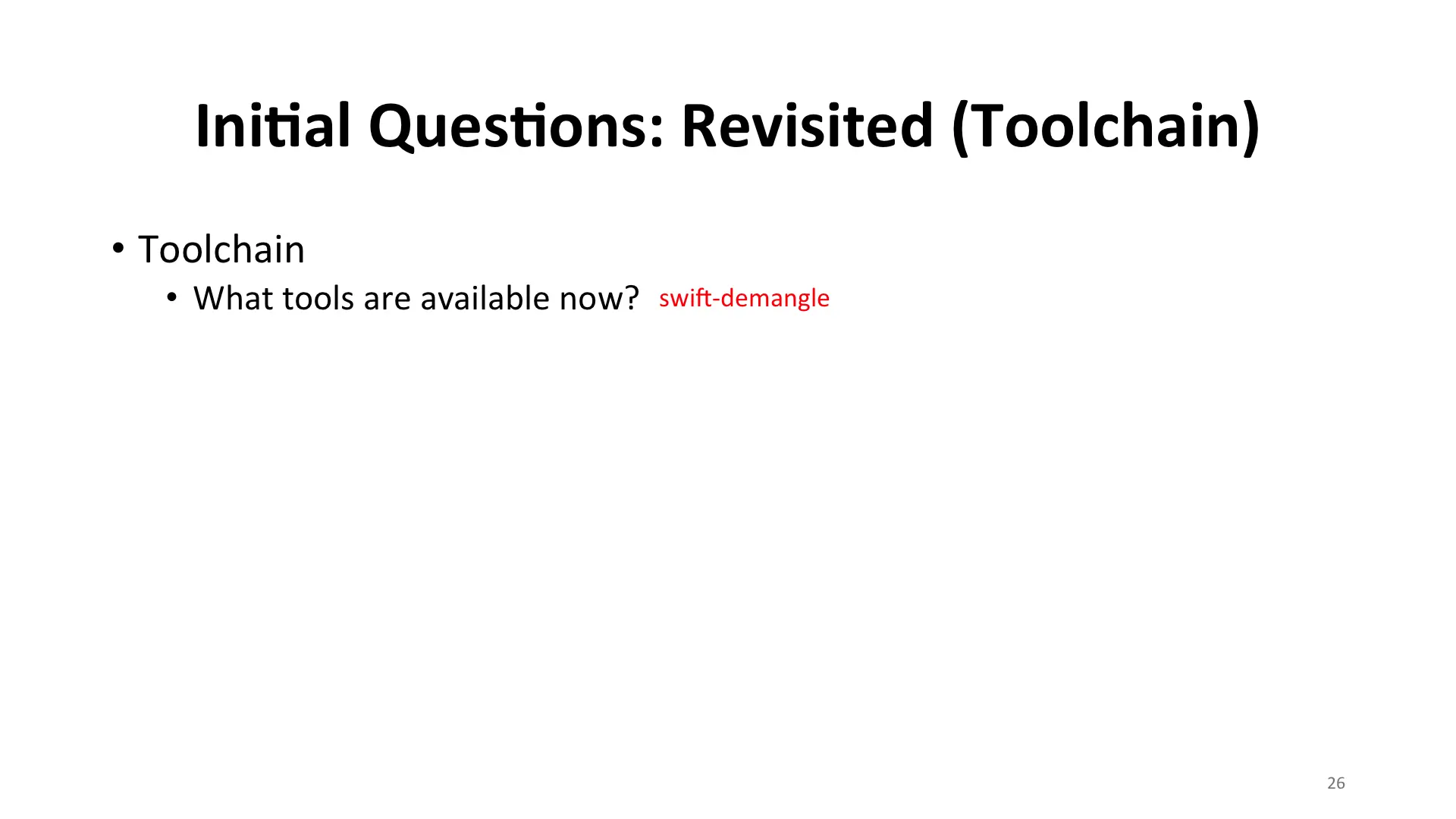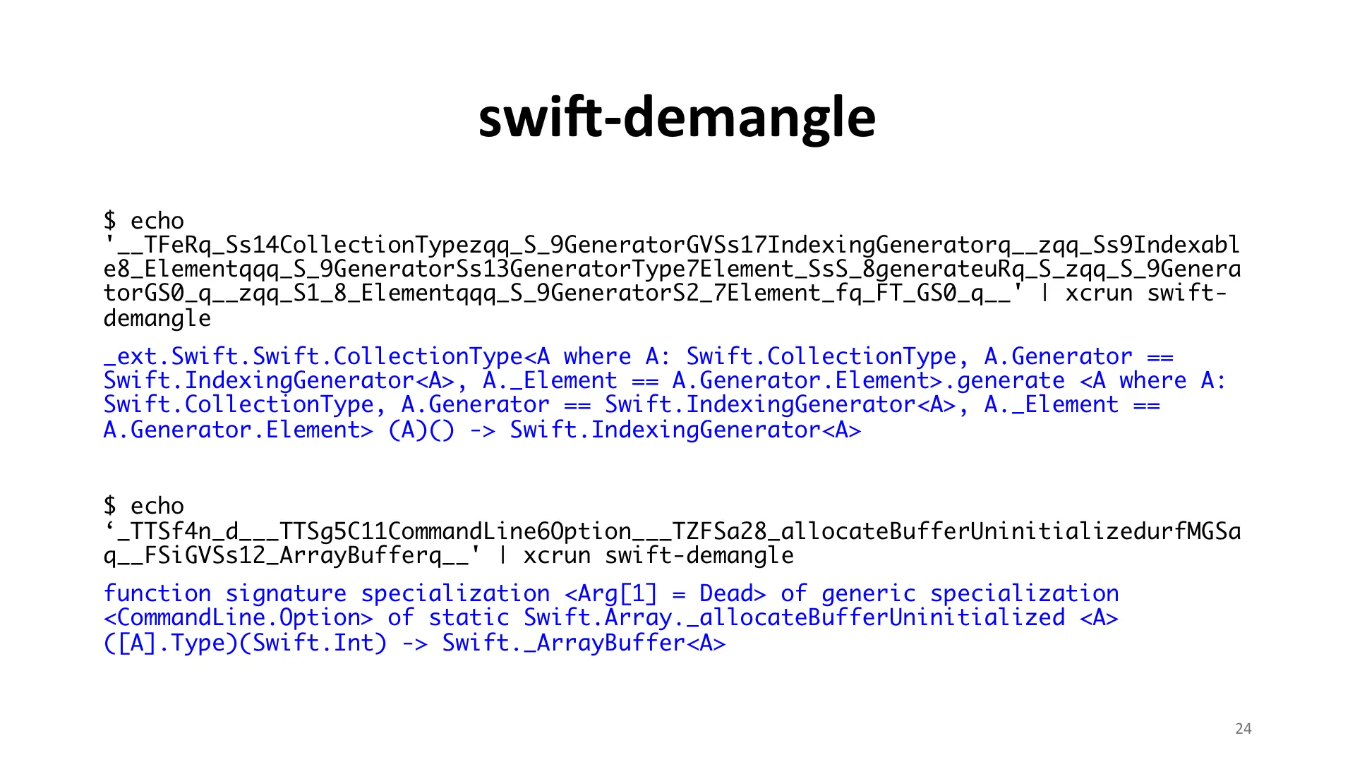 So for existing tools, we only have Swift-demangle. Class-dump, the Objective-C tool, actually parses a surprising amount of Swift classes, but it gets confused. It shouldn’t be too hard to update it to support Swift.