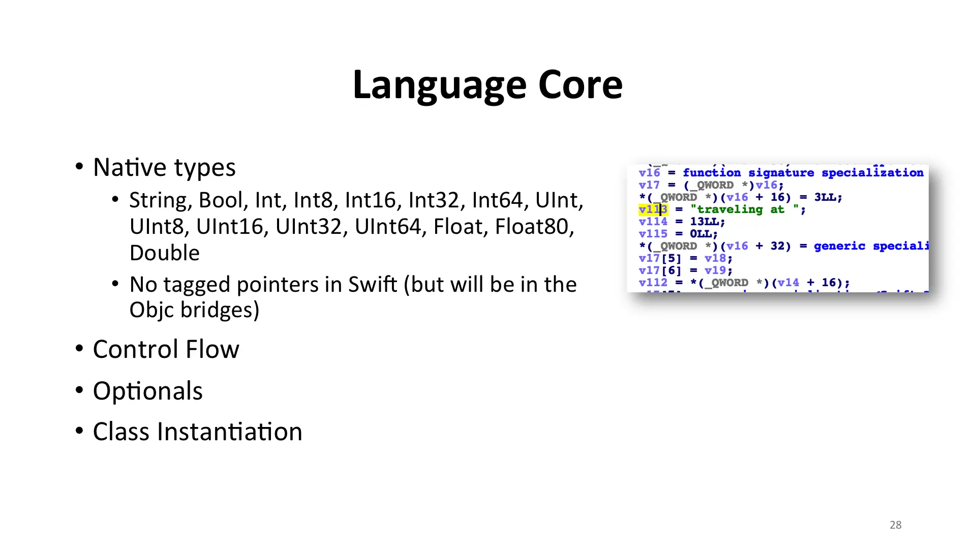 There are a billion things I could put here. I decided to focus on the Native types, Control Flow, and Optionals. I’ve listed the native types, most of these decay into Swift.Builtin types and then decay into LLVM native types. On the right here you can see strings decay into ASCII c strings. I was somewhat surprised that it was an ASCII string and not a wide-character Unicode string. It’s probably actually UTF-8.