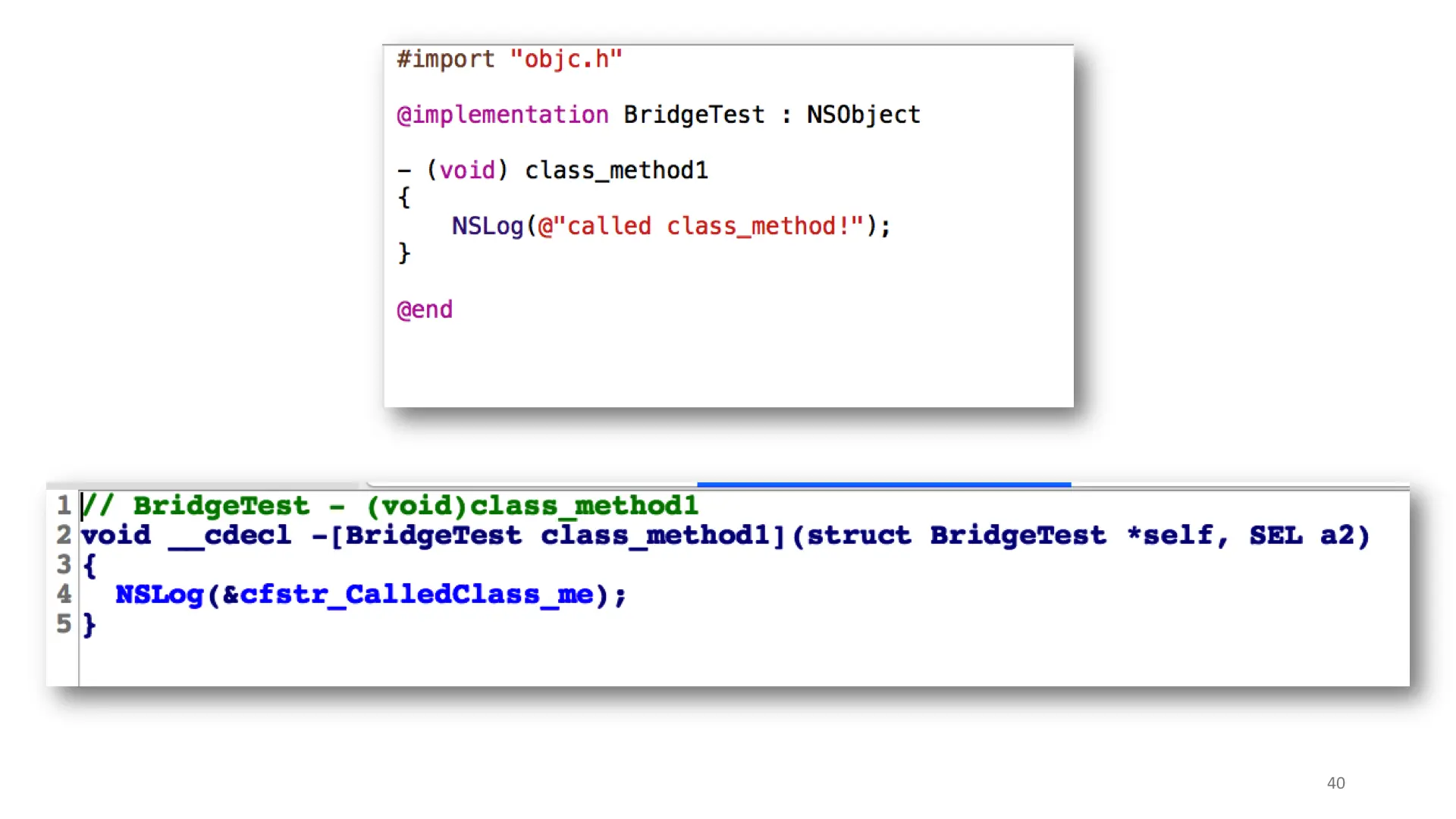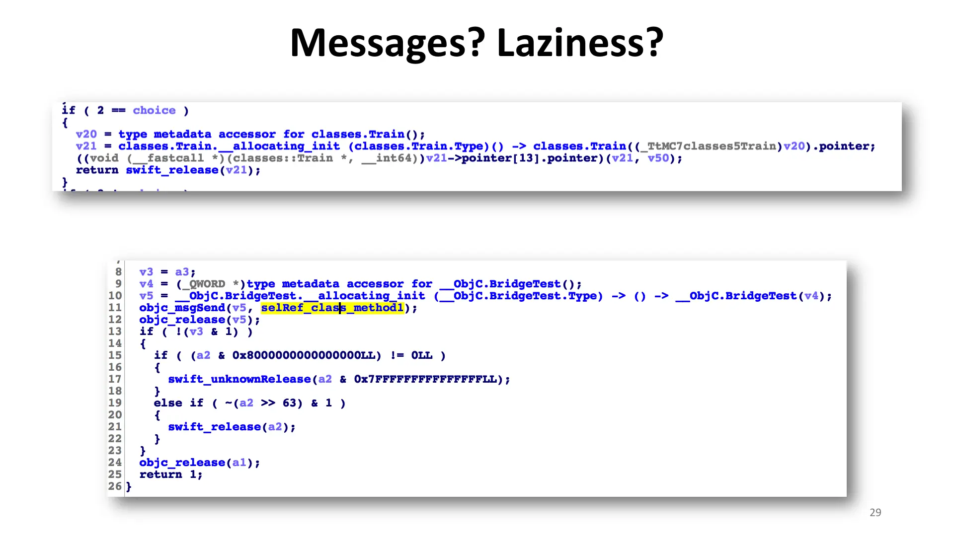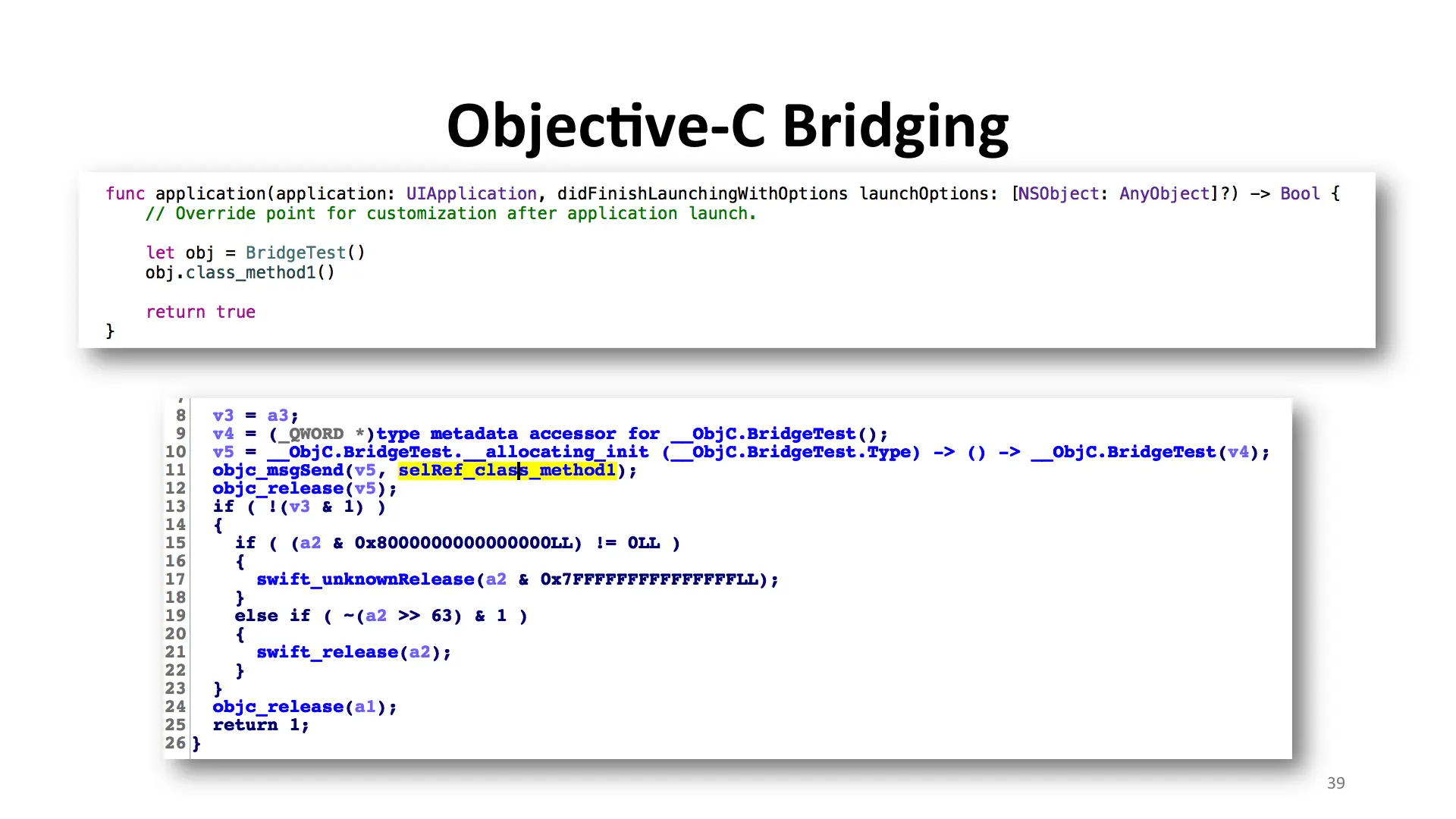 Bridging is quite difficult to do on the command line, but I did eventually get an example (and maybe I cheated with Xcode). Here I create an ObjC class that implements one method and I call it from Swift. Notice the compiler injected an objc_msgSend here, but actually allocated it with a Swift function. A funny mixing and matching.