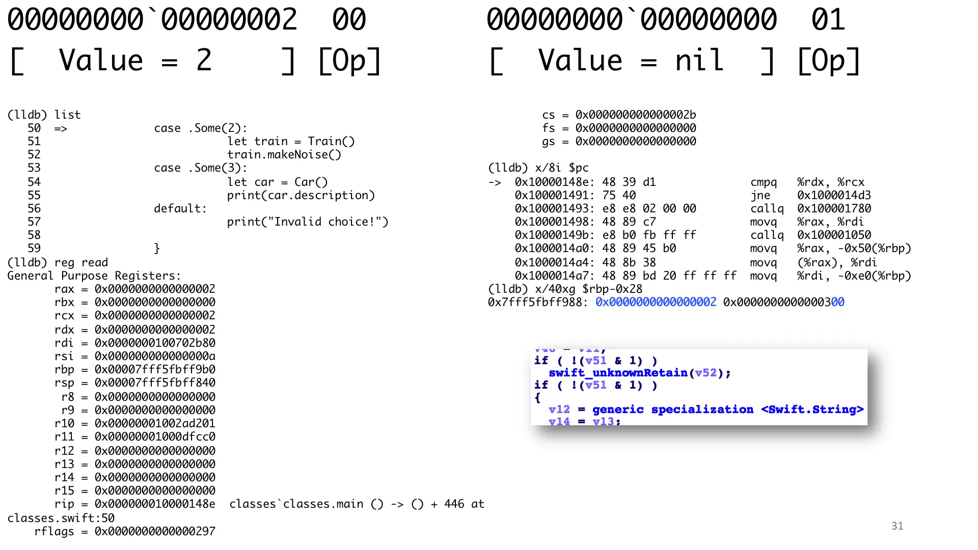 Optionals are actually pretty thin. I don’t know why, but I expected them to be big and bloated. The optional flag is stored as a 1 byte boolean. Up top we have the value .Some(2) and the value .None The Hex-Rays insert shows optional unwrapping. In this case, v51 is the optional flag. v52 is the pointer value that’s getting retained.