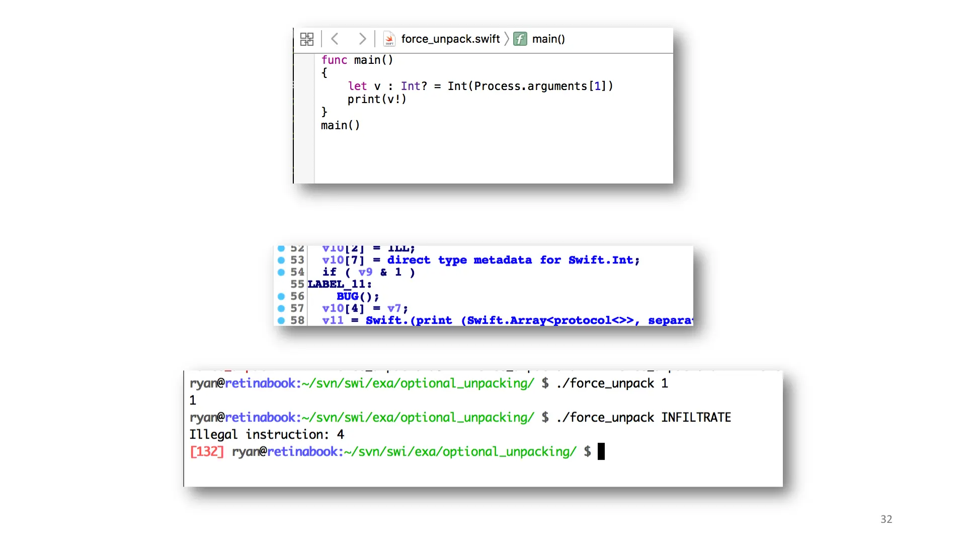 The compiler actually verifies that you properly unpack optionals. If you try to force unpack them, you hit an illegal instruction (represented as a ud2 on x86 and BUG() in HexRays).