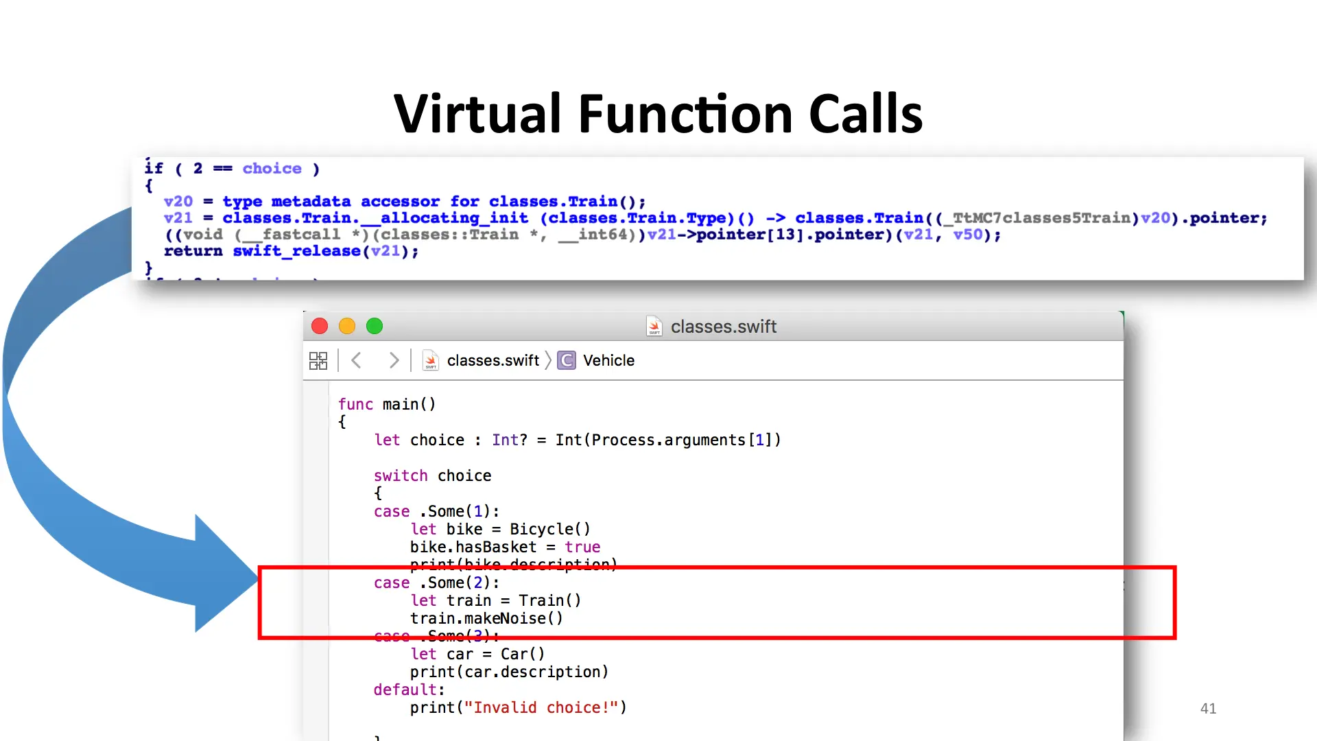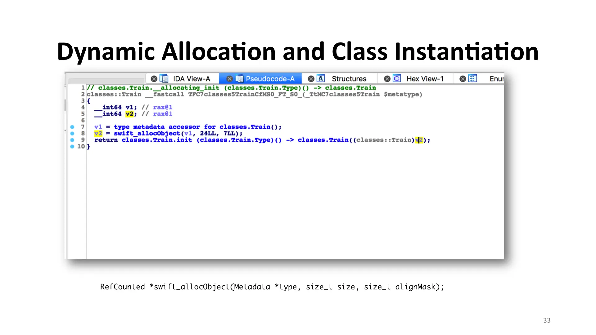 In this example, we’re allocating the Train class. Its size is 24 bytes, its alignment mask is 7 (aka 8 byte boundaries). It then passes the allocated memory to the train constructor. Interesting though, is v1: Swift’s allocator cares about the type.