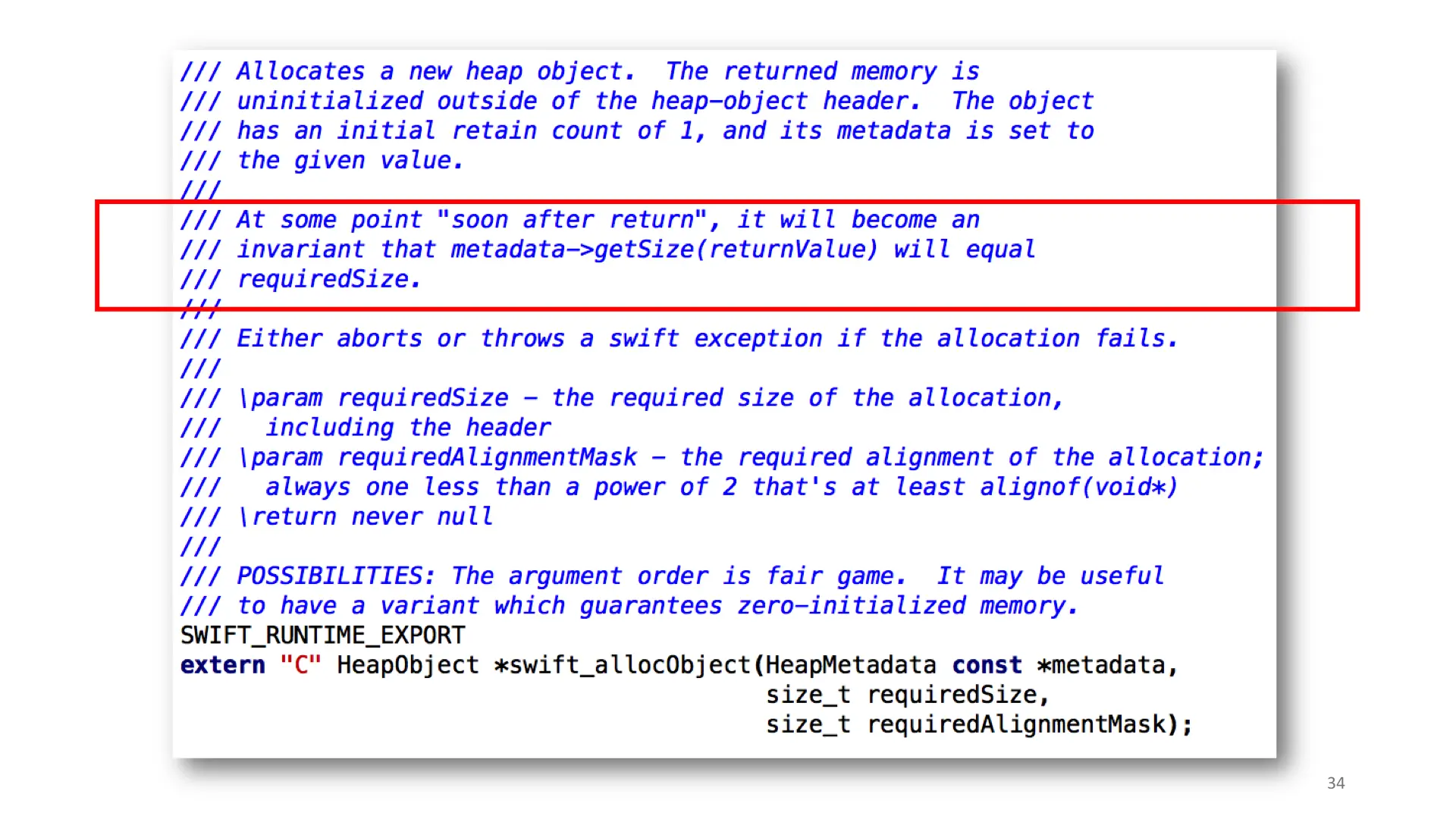 When looking into allocations, I discovered this fun comment in the declaration of Swift_allocObject. I thought it was interesting that it’s “sometime after”. I thought maybe there would be a potential race condition in the future.