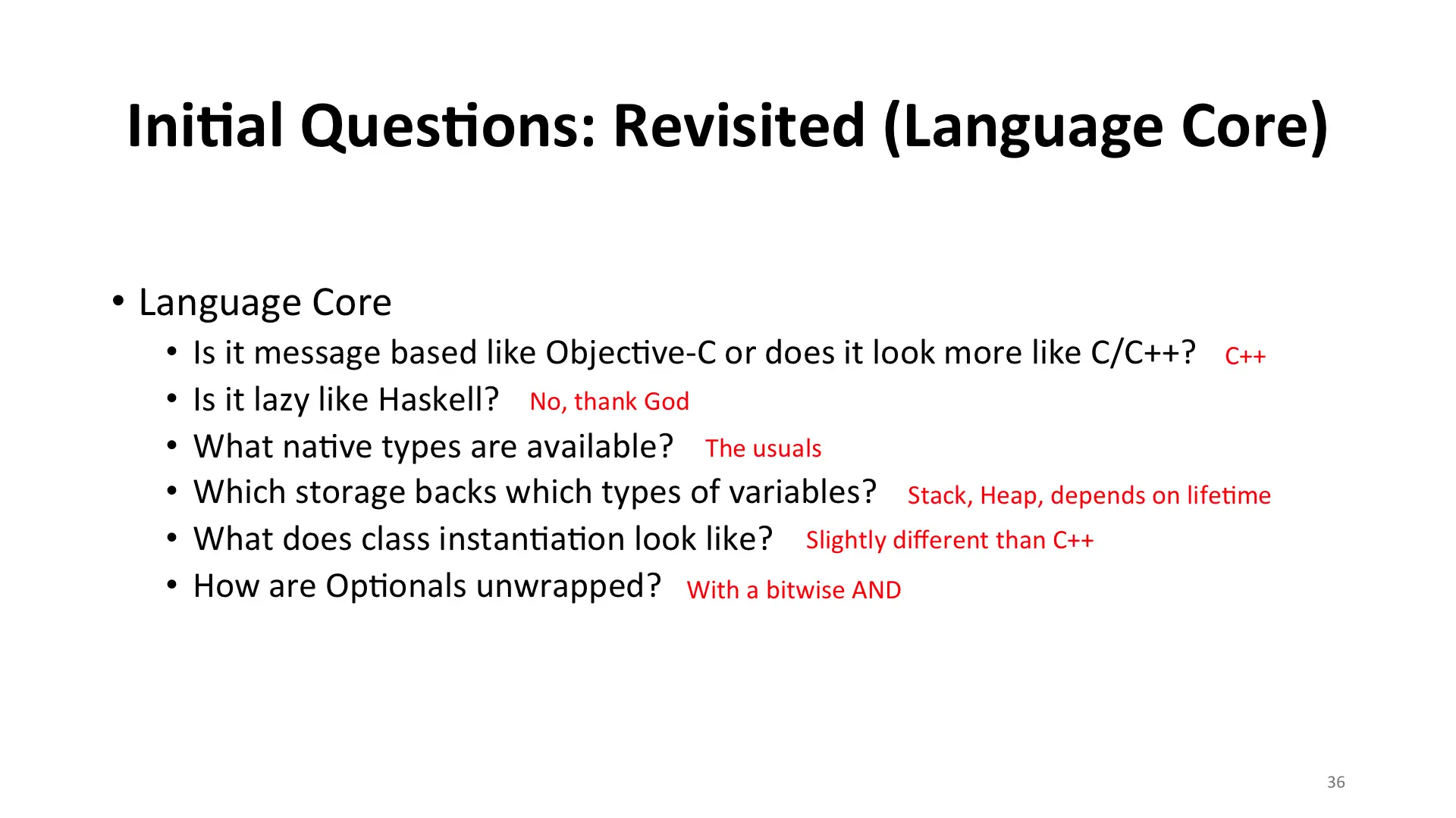 Revisiting our questions, compiled Swift ends up looking a lot like C++. It’s not lazy. It has all the expected native types.
