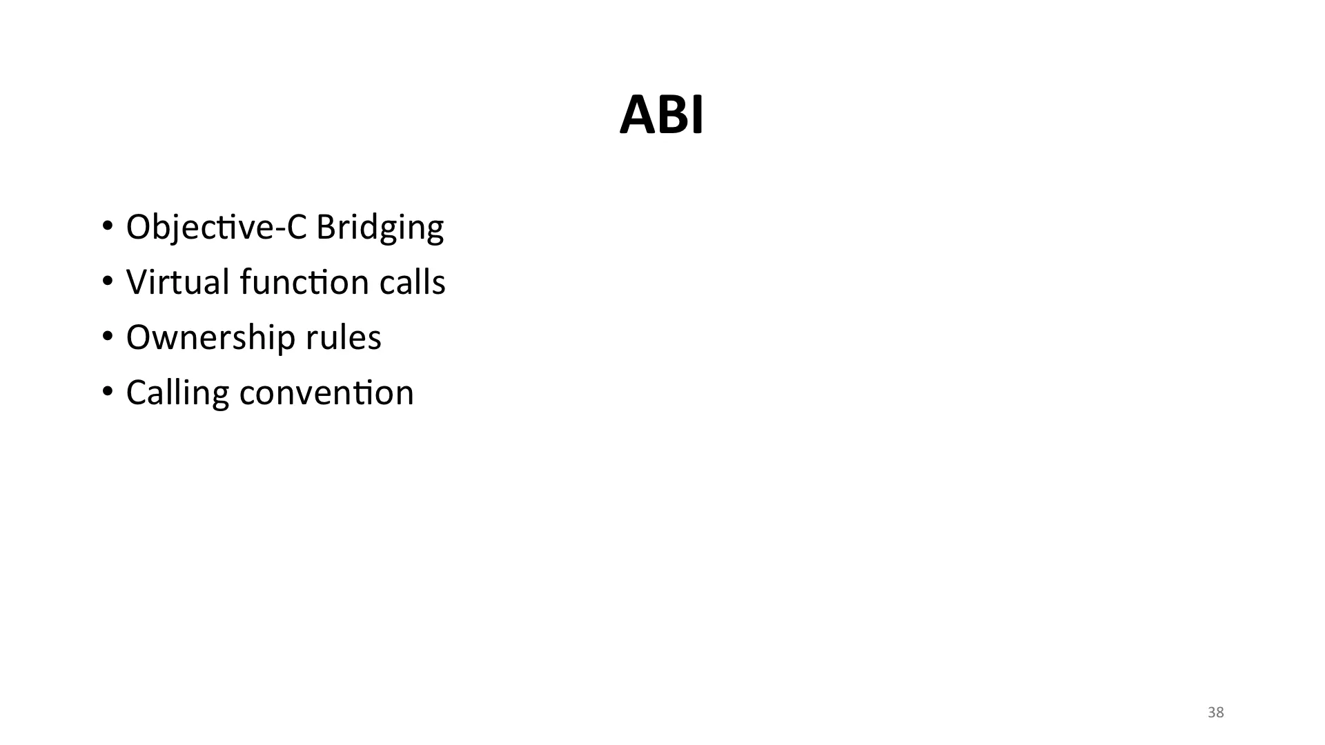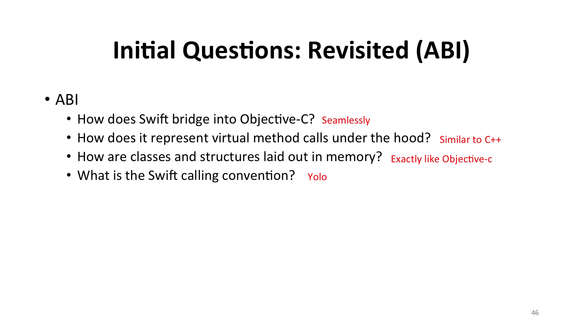 Let’s revisit our initial questions for the ABI. We now know that Swift bridges into ObjC seamlessly, virtual calls are nearly identical to C++, and __swiftcall is basically YOLO. I didn’t mention it, but Swift classes are laid out in memory identically to ObjC classes – in fact, the Swift implementation imposes additional restrictions on ObjC and ends up being the best documentation for the ObjC ABI.