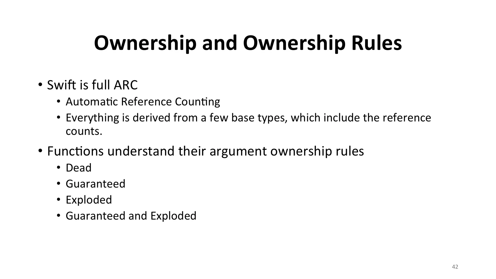 Object ownership rules are pretty well defined in Swift, which is one reason why it’s so safe. Everything in Swift is reference-counted with ARC. Well, that’s not true, native types aren’t reference counted, because that’d be slow and awful like java. Also, stack objects that don’t escape aren’t reference counted, but other than that, they’re all automatically ref counted. This is possible because almost everything is derived from the HeapObject type, which includes a ref count, a data pointer, a type field, and some inline storage for smaller objects.