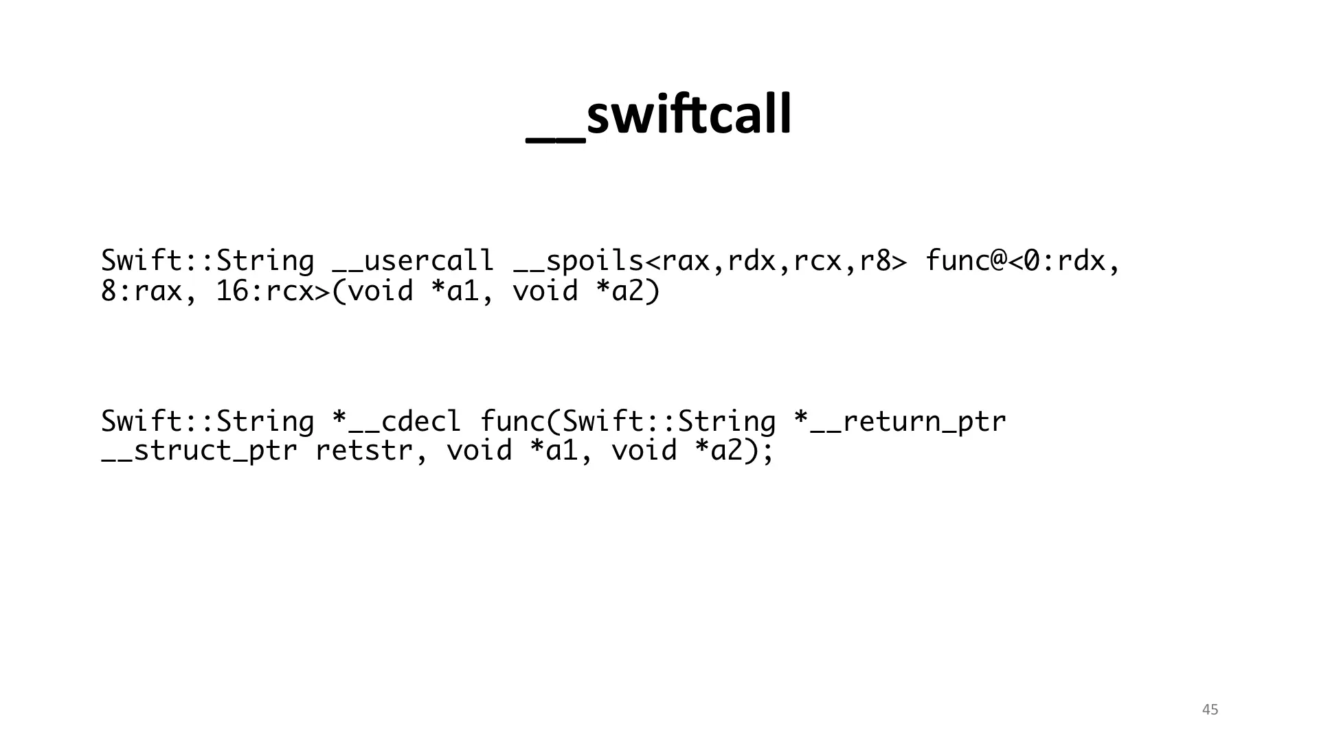 Swift generally follows a “whatever works best” calling convention, which is the most frustrating part of reversing it. HexRays doesn’t understand it yet, so variables appear out of nowhere and are read from, but on closure introspection are actually return values from a preceding call. It makes sense, if your normal stdcall registers are alive but with values not involved in the call, but you have other registers that are dead, why not use the dead registers? or why not reorder the alive registers based on the call. Some compilers will do this when using LTO, as long as your function visibility is set properly. I’m sure many of you have encountered it there.