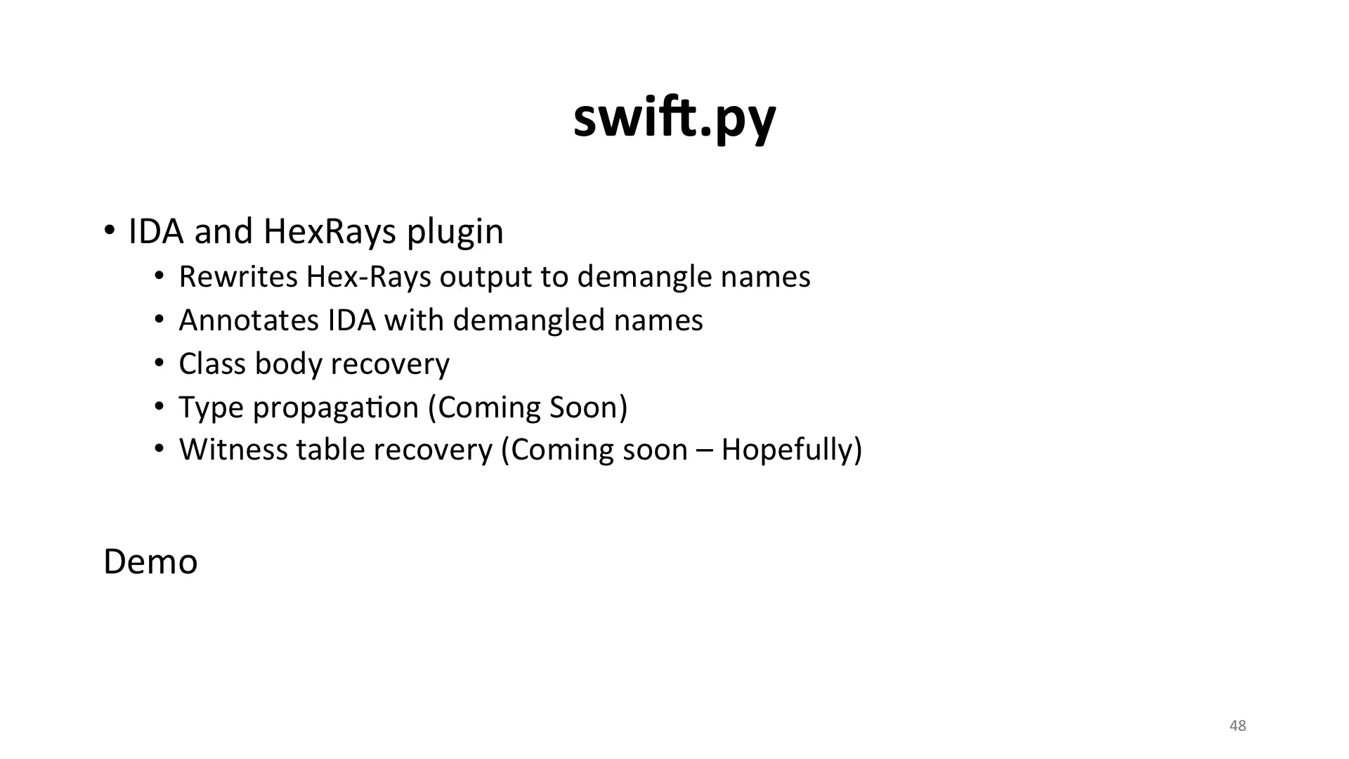Swift.py registers a callback to dynamically re-write all Swift mangled names into their demangled representation. It also annotates the IDA disassembly with the demangled names. It also does a small bit of class body recovery with member types.