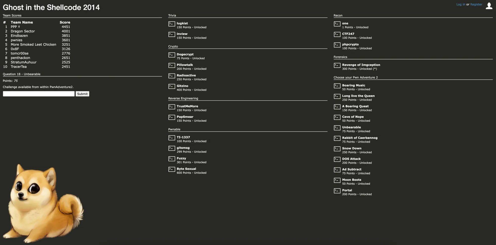 This was the first big Ghost in the Shellcode as it was the first one where we allowed remote teams to compete. All the biggest teams of the day played: PPP, Eindbazen, EuroNOP, pwningyeti, TracerTea, More Smoked Leet Chicken, 0ld Europe, and others.