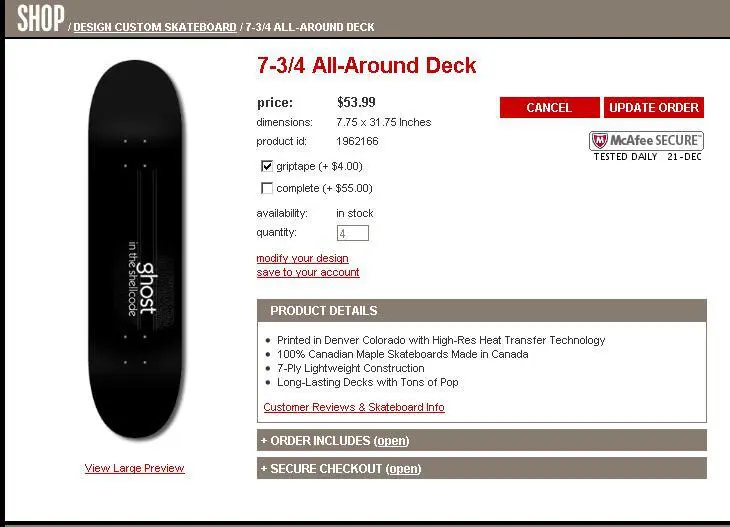 We had planned to give the winning team three boards, but managed to destroy two of them before we gave them away. The boards were shipped without grip tape on the top side, but the grip tape was included – so we figured we’d afix it. I left them in my office on my office couch. Later, a coworker came in and stacked and moved them so he could sit and ask a question. Stacking them put the Ghost in the Shellcode logos in direct contact with the super coarse grip tape, scratching the decks – only the outer one survived and we awarded it to awesie for winning that year.