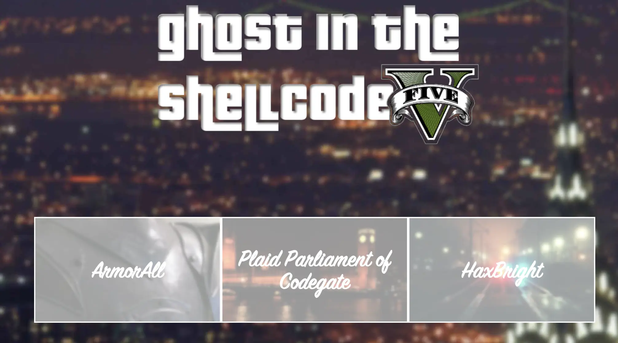 For 2014 we updated the teaser to be a little slicker and made it Grand Theft Auto 5 themed. By 2014 there were a bunch of other CTFs and we were starting to riff on each other’s challenges. That year it was hip to make QR code challenges. Codegate did a bunch and PlaidCTF even more in response – in hopes that it would kill QR codes as a challenge. It backfired because we ended up doing our own QR code challenge and naming it after them: Plaid Parliament of Codegate.
